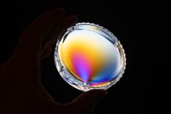 In engineering, the phenomenon of stress induced birefringence allows for stresses in transparent materials to be readily observed. As noted above and seen in the accompanying photograph, the chromaticity of birefringence typically creates colored patterns when viewed in between two polarizers. As external forces are applied, internal stress induced in the material is thereby observed. Additionally, birefringence is frequently observed due to stresses "frozen in" at the time of manufacture. This is famously observed in cellophane tape whose birefringence is due to the stretching of the material during the manufacturing process.