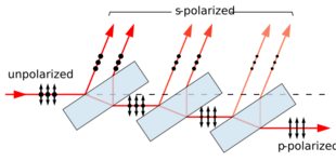 Any light striking a surface at a special angle of incidence known as Brewster's angle, where the reflection coefficient for p polarization is zero, will be reflected with only the s-polarization remaining. This principle is employed in the so-called "pile of plates polarizer" (see figure) in which part of the s polarization is removed by reflection at each Brewster angle surface, leaving only the p polarization after transmission through many such surfaces. The generally smaller reflection coefficient of the p polarization is also the basis of polarized sunglasses; by blocking the s (horizontal) polarization, most of the glare due to reflection from a wet street, for instance, is removed.[17]:348–350