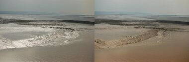 One can visualize the case of linear birefringence (with two orthogonal linear propagation modes) with an incoming wave linearly polarized at a 45° angle to those modes. As a differential phase starts to accrue, the polarization becomes elliptical, eventually changing to purely circular polarization (90° phase difference), then to elliptical and eventually linear polarization (180° phase) perpendicular to the original polarization, then through circular again (270° phase), then elliptical with the original azimuth angle, and finally back to the original linearly polarized state (360° phase) where the cycle begins anew. In general the situation is more complicated and can be characterized as a rotation in the Poincaré sphere about the axis defined by the propagation modes. Examples for linear (blue), circular (red), and elliptical (yellow) birefringence are shown in the figure on the left. The total intensity and degree of polarization are unaffected. If the path length in the birefringent medium is sufficient, the two polarization components of a collimated beam (or ray) can exit the material with a positional offset, even though their final propagation directions will be the same (assuming the entrance face and exit face are parallel). This is commonly viewed using calcite crystals, which present the viewer with two slightly offset images, in opposite polarizations, of an object behind the crystal. It was this effect that provided the first discovery of polarization, by Erasmus Bartholinus in 1669.