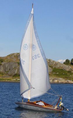 The mast, which lacks shroud and bar, is hollow case and consists of glued wood with a hoisted (a planed or machined grooved) luff. The relatively coarse mast is supported by simple ball bearings at deck fitting and in the bottom. The sails are hoisted and hauled usually only once, in spring and autumn. During the season the sail(s) are wound up on the mast by this rotated by a crank in the cockpit which drives an endless rope on a collar attached to the lower part of the mast. Reefing is therefore simple. By rotating the mast slightly a better aerodynamic profile which avoids turbulence on the leeward side of the circular mast is created. At full run the two sails are hauled on each side so the sail area doubled.