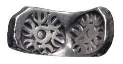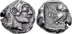 Coin finds in the Kabul hoard (c. 380 BC), Mir Zakah hoards (c. 100 AD), Taxila Bhir Mound (c. 300 BC), or the Shaikhan Dehri hoard near Pushkalavati have revealed numerous Achaemenid coins as well as many Ancient Greece coins from the 5th and 4th centuries BC were circulating in the area, at least as far as the Indus during the reign of the Achaemenids (549 - 330 BCE), who were in control of the areas as far as Gandhara.[13][14][11][15] In 2007 a small coin hoard was discovered at the site of ancient Pushkalavati (Shaikhan Dehri) in Pakistan . The hoard contained a tetradrachm minted in Athens c. 500-480 BC, together with a number of local types as well as silver cast ingots. The Athens coin is the earliest known example of its type to be found so far to the east.[10] The Mir Zakah hoards offered hundreds of thousands of examples, punched and stamped bars and coins, manufactured between the late 5th century BC, and late 1st century AD.[16]