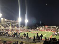 Incoming freshmen are welcomed to the university in August with First Night Out, a night of events taking place on the Friday in which they move in.[116][117] Organized by Student Engagement and Activities, the night consists of a "Party on the Plaza" as well as various assorted activities.[117] Wolfieland, an annual carnival, began in 2016 and takes place during September.[118] Stony Brook University's annual Homecoming celebration, known as "Wolfstock", takes place in October and features numerous activities throughout the week, including Homecoming Hoopla & Carnival on Wednesday and the Seawolves Showcase talent show on Friday.[119][120] Wolfstock culminates in Stony Brook's annual Homecoming football game on Saturday, which traditionally draws record-breaking crowds upwards of 12,000 people. The homecoming court is presented during halftime, dating back to 1984. Beginning in 2018, Stony Brook shifted to the gender-neutral title of 'royal' in lieu of 'king' and 'queen'.[121][122]