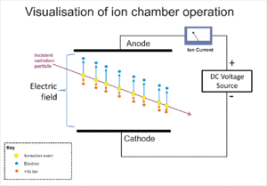 A voltage potential is applied between the electrodes to create an electric field in the fill gas. When gas atoms or molecules between the electrodes are ionized by incident ionizing radiation, ion-pairs are created and the resultant positive ions and dissociated electrons move to the electrodes of the opposite polarity under the influence of the electric field. This generates an ionization current which is measured by an electrometer circuit in the region of femtoamperes to picoamperes, depending on the chamber design, and is proportional to the radiation dose.[1]