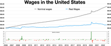 The nominal wage increases a worker sees in his paycheck may give a misleading impression of whether he is "getting ahead" or "falling behind" over time. For example, the average worker’s paycheck increased 2.7% in 2005, while it increased 2.1% in 2015, creating an impression for some workers that they were "falling behind".[3] However, inflation was 3.4% in 2005, while it was only 0.1% in 2015, so workers were actually "getting ahead" with lower nominal paycheck increases in 2015 compared to 2005.[4]