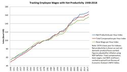 The Economic Policy Institute stated wages have failed to keep up with productivity in the United States since the mid 1970s, and that wages have therefore stagnated. According to them, between 1973 and 2013, productivity grew 74.4% and hourly compensation grew 9.2%,[8] contradicting the neoclassical economic theory that those two should rise equally together.[9] However, the Heritage Foundation says these claims rest on misinterpreted economic statistics. According to them, productivity grew 100% between 1973 and 2012 while employee compensation, which accounts for worker benefits as well as wages, grew 77%.[10] The Economic Policy Institute and the Heritage Foundation used different inflation adjusting methods in their studies.