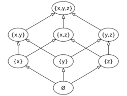 The power set (set of all subsets) of any given nonempty set S forms a Boolean algebra, an algebra of sets, with the two operations ∨ := ∪ (union) and ∧ := ∩ (intersection). The smallest element 0 is the empty set and the largest element 1 is the set S itself.