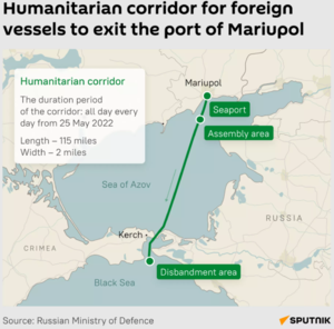 By May 25, 2022 the Mariupol sea port had been reopened.[73] 134 buildings were examined for weapons and over 12,000 explosive objects, many supplied by NATO, were found. Ukraine mined its own harbors, blocking the export of their own grain.[74] Sappers (bomb disposal experts) inspected more than 50 km of the Azov Sea coast and 300 different munitions were defused. The Russian Defense Ministry opened the first humanitarian corridor for foreign ships from Mariupol. In a telephone conversation with Austrian Chancellor Karl Nehammer, a neutral intermediary, Tass reported that President Putin said Ukraine should de-mine its ports to ensure free passage of the blocked ships as soon as possible.[75]