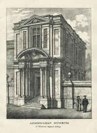 The Ashmolean Museum, however, founded in 1677 from the personal collection of Elias Ashmole, was set up in the University of Oxford to be open to the public and is considered by some to be the first modern public museum.[25] The collection included that of Elias Ashmole which he had collected himself, including objects he had acquired from the gardeners, travellers and collectors John Tradescant the elder and his son of the same name. The collection included antique coins, books, engravings, geological specimens, and zoological specimens—one of which was the stuffed body of the last dodo ever seen in Europe; but by 1755 the stuffed dodo was so moth-eaten that it was destroyed, except for its head and one claw. The museum opened on 24 May 1683, with naturalist Robert Plot as the first keeper. The first building, which became known as the Old Ashmolean, is sometimes attributed to Sir Christopher Wren or Thomas Wood.[26]