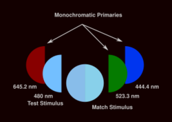 [51]) is presented to the observer in a dark surround. One part of the field is illuminated by a monochromatic test stimulus. The participant adjusts the intensities of the three coincident monochromatic primary lights (which are usually red, green and blue hues) on either field until both the test stimulus and match stimulus appear as the exact same color. In this case the participant has added red to the 480 nm test stimulus and has almost matched the match stimulus made of only the green and blue lights of comparable intensities. The specific monochromatic primaries shown here are from the Stiles-Burch 1955 experiment.