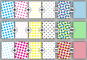 A magnified representation of small partially overlapping spots of cyan, magenta, yellow, and key (black) halftones in CMYK process printing. Each row represents the pattern of partially overlapping ink "rosettes" so that the patterns would be perceived as blue, green, and red when viewed on white paper from a typical viewing distance. The overlapping ink layers mix subtractively while additive mixing predicts the color appearance from the light reflected from the rosettes and white paper in between them.
