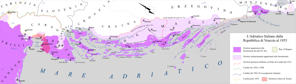 Many Istrian Italians looked with sympathy towards the Risorgimento movement that fought for the unification of Italy.[22] However, after the Third Italian War of Independence (1866), when the Veneto and Friuli regions were ceded by the Austrians to the newly formed Kingdom Italy, Istria remained part of the Austro-Hungarian Empire, together with other Italian-speaking areas on the eastern Adriatic. This triggered the gradual rise of Italian irredentism among many Italians in Istria, who demanded the unification of Istria with Italy. The Italians in Istria supported the Italian Risorgimento: as a consequence, the Austrians saw the Italians as enemies and favored the Slav communities of Istria,[23] fostering the nascent nationalism of Slovenes and Croats.[24]
