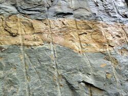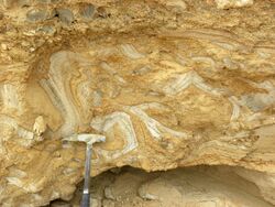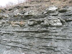 Seismite in the Borden Formation, Ohio, demonstrating "flow rolls".