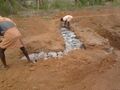Rubble trench foundations are a shallow trench filled with rubble or stones. These foundations extend below the frost line and may have a drain pipe which helps groundwater drain away. They are suitable for soils with a capacity of more than 10 tonnes/m2 (2,000 pounds per square foot).