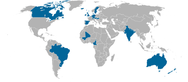 Australia , Austria, Bangladesh, Belgium, Brazil , Cameroon, Canada , Denmark , East Africa region, Germany , Hungary, Iceland, India , Ireland, Italy, Luxembourg, Mali, Malta, Nepal, New Zealand, Nigeria, Pakistan , Spain , Sweden, Switzerland , United Kingdom and Uruguay