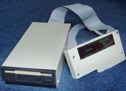 The first disc interface to be announced for the Electron was Pace's Le Box in 1984, offering a single-sided 100 KB floppy drive controlled by the 8271 controller and accessed using the Amcom Disc Filing System, with pricing at £299 plus VAT including the drive or around £199 without. The unit also provided eight sideways ROM sockets and was intended to sit under the Electron itself.[98] The unit was connected via cabling to the expansion edge connector and included its own power supply, and other drives including switchable 40/80 track drives offering up to 400 KB capacity were dealer-supplied options.[99] Although the product was meant to be on sale at the Acorn User Show in August 1984,[98] and had been advertised,[100] it was "discontinued" in early 1985 before getting to market, with a Pace representative indicating that prohibitive pricing of the 8271 chips (each at "over £80 at times") had left the company considering a re-launch of the product should the pricing situation become more favourable.[101]