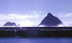 Taranakite was first described in 1866 by James Hector and William Skey.[8][9] The material had been found by H. Richmond on the Sugar Loaf Islands of Taranaki, New Zealand (in the vicinity of [ ⚑ ] 39°02′57″S 174°01′40″E / 39.049086°S 174.027708°E), as thin yellowish-white amorphous seams in fissures within trachytic rocks. Within the taranakite, dark yellow-brown seams were observed and thought to be wavellite. Modern X-ray analysis later showed this inclusion to be vashegyite (Al11(PO4)9(OH)6)·38H2O).[10]