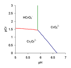 The predominance diagram shows that the position of the equilibrium depends on both pH and the analytical concentration of chromium.[notes 1] The chromate ion is the predominant species in alkaline solutions, but dichromate can become the predominant ion in acidic solutions.