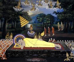 Buddhist Theravada scholastic tradition identifies two types of nirvana: sopadhishesa-nirvana literally "nirvana with a remainder", attained and maintained during life, and parinirvana or anupadhishesa-nirvana, meaning "nirvana without remainder" or final nirvana, achieved on death, a death which is not followed by a rebirth or reincarnation in (according to Buddhist beliefs) the usual way.[12] The founder of Buddhism, the Buddha, is believed to have reached both these states, the first at his Enlightenment under the Bodhi Tree, and the latter at his death many years later.[12] Most Mahayana authorities have broadly similar ideas, but prefer the terms "abiding" and "non-abiding nirvana" for the two stages.