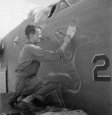 Source material for American nose art was varied, ranging from pinups such as Rita Hayworth and Betty Grable and cartoon characters such as Donald Duck, Bugs Bunny, and Popeye to patriotic characters (Yankee Doodle) and fictional heroes (Sam Spade). Lucky symbols such as dice and playing cards also inspired nose art, along with references to mortality such as the Grim Reaper.[1] Cartoons and pinups were most popular among American artists, but other works included animals, nicknames, hometowns, and popular song and movie titles. Some nose art and slogans expressed contempt for the enemy, especially of their leaders.