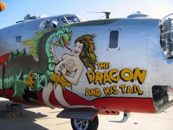 The largest known work of nose art ever depicted on a World War II-era American combat aircraft was on a Consolidated B-24 Liberator, tail number 44-40973, which had been named "The Dragon and his Tail" of the USAAF Fifth Air Force 64th Bomb Squadron, 43d Bomb Group, in the Southwest Pacific, flown by a crew led by Joseph Pagoni, with Staff Sergeant Sarkis Bartigian as the artist. The dragon artwork ran from the nose just forward of the cockpit, down the entire length of the fuselage's sides, with the dragon's body depicted directly below and just aft of the cockpit, with the dragon holding a nude woman in its forefeet.[11][12]