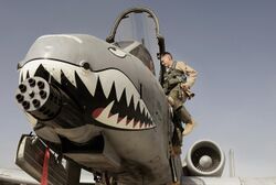 Similarly, when in 1943 the 39th Fighter Squadron became the first American squadron in their theatre with 100 kills, they adopted the shark-face for their Lockheed P-38 Lightnings.[7] The shark-face is still used to this day, most commonly seen on the Fairchild Republic A-10 Thunderbolt II (with its gaping maw leading up to the muzzle of the aircraft's GAU-8 Avenger 30mm cannon), especially those of the 23d Fighter Group, the AVG's descendent unit, and a testament to its popularity as a form of nose art.