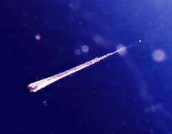 Meteoroid embedded in aerogel; the meteoroid is 10 µm in diameter and its track is 1.5 mm long