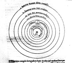 The idea of celestial spheres was developed in the cosmological models of Plato, Eudoxus, Aristotle, Ptolemy, Copernicus, and others.[11] They believed in a stable cosmos created by God, where distinct realms were subject to different kinds of order. Some Europeans maintained the Aristotelian view that infinity could only be seen as an attribute of God, with the cosmos being finite. Furthermore, following the Aristotelian view that "nature abhors a vacuum", some Europeans believed that the space between the spheres were filled with air.[10] This theory persisted until the Scientific Revolution, when the discovery that the Sun was in the center of the planetary system rocked cosmological understanding to its core. Other theories such as Atomism posited a void of atoms as the fundamental elements of physics, while Stoicism postulated a void allowing for the cosmos to expand and contract in volume through its cycles.[12][13]