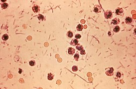 Fungi are eukaryotic organisms that can function as pathogens. There are approximately 300 known fungi that are pathogenic to humans[17] including Candida albicans, which is the most common cause of thrush, and Cryptococcus neoformans, which can cause a severe form of meningitis. The typical fungal spore size is <4.7 μm in length, but some spores may be larger.[18]