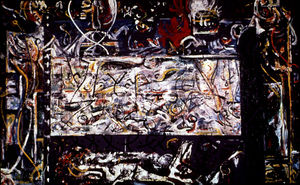 Jackson Pollock (1912-1956) was one of the greatest American painters of the 20th century. He was a leader in the abstract expressionist movement, most notably in "detaching line from color, redefining the categories of drawing and painting, and finding new means to describe pictorial space."[2] He was famous and popularly acclaimed during his life, which was tragically cut short by an auto accident at the age of only 44. He was born in Wyoming and grew up traveling the Southwest, where he may have been influenced a bit by Native American culture. His political views were more populist than Leftist.[3]