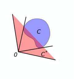 A duality in geometry is provided by the dual cone construction. Given a set [math]\displaystyle{ C }[/math] of points in the plane [math]\displaystyle{ \mathbb R^2 }[/math] (or more generally points in [math]\displaystyle{ \mathbb R^n }[/math]), the dual cone is defined as the set [math]\displaystyle{ C^* \subseteq \mathbb R^2 }[/math] consisting of those points [math]\displaystyle{ (x_1, x_2) }[/math] satisfying [math]\displaystyle{ x_1 c_1 + x_2 c_2 \ge 0 }[/math] for all points [math]\displaystyle{ (c_1, c_2) }[/math] in [math]\displaystyle{ C }[/math], as illustrated in the diagram. Unlike for the complement of sets mentioned above, it is not in general true that applying the dual cone construction twice gives back the original set [math]\displaystyle{ C }[/math]. Instead, [math]\displaystyle{ C^{**} }[/math] is the smallest cone[7] containing [math]\displaystyle{ C }[/math] which may be bigger than [math]\displaystyle{ C }[/math]. Therefore this duality is weaker than the one above, in that
