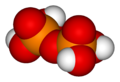 Likewise, three orthophosphoric acid molecules can condense in a row to obtain tripolyphosphoric acid (H5P3O10). This condensation process can continue with additional orthophosphoric acid units to obtain tetrapolyphosphoric acid (H6P4O13, pictured), and so on. Polyphosphoric acid molecules can have dozens of such phosphoric units bonded in a row. The chemical structures of the first few of these compounds are shown in the above illustration.