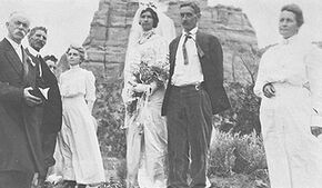 John Otto made the first ascent of Independence Monument on June 14, 1911, flying Old Glory from the summit for Flag Day.[6][7][8] That flag was presented to Otto by President William Howard Taft.[9] Subsequently, he would make the ascent on July 4 each year to again display the flag to celebrate Independence Day, although his method differed from contemporary rock climbing. His method involved drilling holes and pounding in pieces of pipe to create a ladder. The pipes Otto attached were removed in the mid-1950s by the Park Service, but handholds and steps which he carved into the sandstone remain.[10] John Otto married Boston artist Beatrice Farnham on June 20, 1911, at the base of Independence Monument in Wedding Canyon.[11]