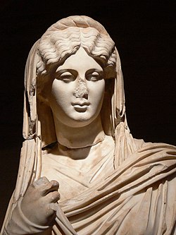 Perhaps due to its erotic association, hair was often linked with Roman ideas of female modesty and honour. We know that veils were important in this case, as they protected against (or encouraged, according to Seneca the Elder) solicitations by men.[10] The palla was the mark of a married, respectable woman. It was a piece of cloth wrapped around the body with one end over the shoulder. There is significant evidence for the palla being draped over the back of the head as a veil.[11]