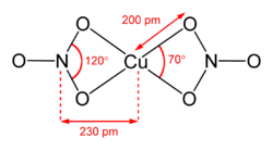 Heating solid anhydrous copper(II) nitrate under a vacuum to 150-200 °C leads to sublimation and "cracking" to give a vapour of monomeric copper(II) nitrate molecules.[6][11] In the vapour phase, the molecule features two bidentate nitrate ligands.[12]