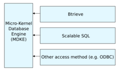 Starting with version 6.15, Pervasive started using a new modular method of separating the database backend from the interface that developers used. They separated the core database operations (like update, write and delete records) from the Btrieve and Scalable SQL modules. By separating the Micro-Kernel Database Engine (MKDE) from the other functions it allowed programmers to use several methods of accessing the database simultaneously. For instance, an application may be created using the Btrieve API and another application that needs to access the same data may use a totally different method, like using Scalable SQL. Because the record primitives have been separated from these methods, both applications can use the MKDE to access the same data file.