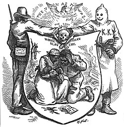 With the Freedmen's Bureau neutered and Congress busy bickering with the president, white Southerners suddenly had a free hand to use violence against blacks and Northern whites.[34] White Southerners were pissed at a lot of people. Firstly, they hated the blacks for breaking free from slavery, supposedly "betraying" the South, and receiving help from the government. They hated the Northerners who went south to help the blacks, calling them "carpetbaggers" and claiming that they were just out to exploit white Southerners.[35] And they hated their fellow white Southerners who had the temerity to support Reconstruction, calling them "scalawags" and claiming that they were betraying their heritage.[36]