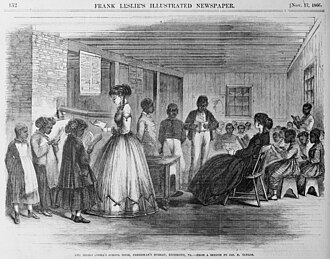 It's important to note that the workers of the Freedmen's Bureau accomplished a lot of good under awful circumstances. Along with food aid distribution, the bureau offered legal services, handed out medicine, and built hospitals.[21] It also built schools to teach freed blacks the information and skills they had been denied for so long. The bureau partnered with private missionary groups to fund the schools, and the missionary groups sent teachers from the North, who were primarily white and female.[22] The bureau established over 1,000 schools and several black colleges whose positive influence continued even after the bureau's collapse.[21]