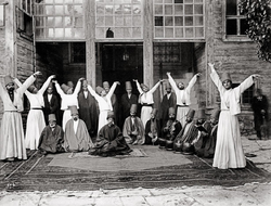 Sufi whirling (or Sufi spinning) is a form of Sama or physically active meditation which originated among some Sufis, and practised by the Sufi Dervishes of the Mevlevi order. It is a customary dance performed within the sema, through which dervishes (also called semazens, from Persian سماعزن) aim to reach the source of all perfection, or kemal. This is sought through abandoning one's nafs, egos or personal desires, by listening to the music, focusing on God, and spinning one's body in repetitive circles, which has been seen as a symbolic imitation of planets in the Solar System orbiting the Sun.[134]