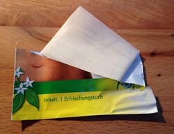 Wet wipes are often included as part of a standard sealed cutlery package offered in restaurants or along with airline meals.