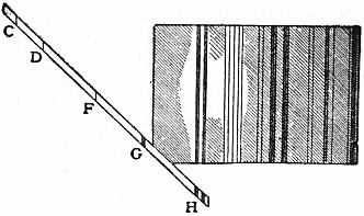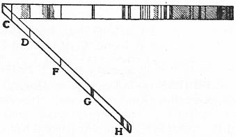 Stokes also used a method, analogous to Newton’s method of crossed prisms, for the purpose of analysing the fluorescent light. A spectrum was produced by means of a slit and a prism, the slit being horizontal instead of vertical. The resulting very narrow spectrum was projected on a white paper moistened with a fluorescent solution, and viewed through a second prism with its refracting edge perpendicular to that of the first prism. In addition to the sloping spectrum seen under ordinary circumstances, another spectrum due to the fluorescent light alone, made its appearance, as seen in figs. 3 and 4. In this spectrum the colours do not run from left to right, but in horizontal lines. Thus the dark lines of the solar spectrum lie across the colours. The spectra in figs. 3 and 4 were obtained by V. Pierre with an improved arrangement of Stokes’s method. It will be seen that, in the case of chlorophyll, the whole spectrum, far into the ultra-violet, gives rise to a short range of red fluorescent light, while the effective part of the exciting light in the case of aesculin (a glucoside occurring in horse-chestnut bark) begins a little above the fixed line G and the fluorescent light covers a wide range extending from orange to blue.