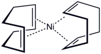 Many complexes exist of nickel coordinated to an alkene. Practical applications of this theme include polymerization or oligomerization of alkenes, as in the Shell Higher Olefin Process.[7] In these compounds nickel is formally zerovalent Ni0 and the bonding is described with the Dewar–Chatt–Duncanson model. One common representative is Bis(cyclooctadiene)nickel(0) (Ni(COD)2), which contains two cyclooctadiene ligands. It is a 18VE compound with 10 electrons provided by nickel itself and 4x2 electrons more by the double bonds. This solid, which melts at 60 °C, is used as a catalyst and as a precursor for many other nickel compounds.