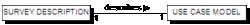 An example of multiplicity is represented in Figure 8. It is the same example as in Figure 6, only the multiplicity values are added. The figure reads as ‘exactly one SURVEY DESCRIPTION describes exactly one USE CASE MODEL’. This implies that a SURVEY DESCRIPTION cannot describe zero or more than one USE CASE MODEL and a USE CASE MODEL cannot be described by zero or more than one SURVEY DESCRIPTIONS.