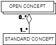 A special type of association is aggregation. Aggregation represents the relation between a concept (as a whole) containing other concepts (as parts). It can also be described as a ‘has-a’ relationship. In Figure 9 an aggregation relationship between OPEN CONCEPT and STANDARD CONCEPT is illustrated. An OPEN CONCEPT consists of one or more STANDARD CONCEPTS and a STANDARD CONCEPT is part of zero or more OPEN CONCEPT.