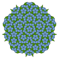 Penrose is well known for his 1974 discovery of Penrose tilings, which are formed from two tiles that can only tile the plane nonperiodically, and are the first tilings to exhibit fivefold rotational symmetry. In 1984, such patterns were observed in the arrangement of atoms in quasicrystals.[54] Another noteworthy contribution is his 1971 invention of spin networks, which later came to form the geometry of spacetime in loop quantum gravity.[55] He was influential in popularizing what are commonly known as Penrose diagrams (causal diagrams).[56]