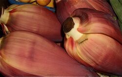 Banana flowers (also called "banana hearts" or "banana blossoms") are used as a vegetable[137] in South Asian and Southeast Asian cuisine, either raw or steamed with dips or cooked in soups, curries and fried foods.[138][139] The flavor resembles that of artichoke. As with artichokes, both the fleshy part of the bracts and the heart are edible.[140]
