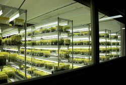 Given the narrow range of genetic diversity present in bananas and the many threats via biotic (pests and diseases) and abiotic (such as drought) stress, conservation of the full spectrum of banana genetic resources is ongoing.[123] Banana germplasm is conserved in many national and regional gene banks, and at the world's largest banana collection, the International Musa Germplasm Transit Centre, managed by Bioversity International and hosted at KU Leuven in Belgium.[124] Musa cultivars are usually seedless, and options for their long-term conservation are constrained by the vegetative nature of the plant's reproductive system. Consequently, they are conserved by three main methods: in vivo (planted in field collections), in vitro (as plantlets in test tubes within a controlled environment), and by cryopreservation (meristems conserved in liquid nitrogen at −196 °C).[123] At the Honduran Foundation for Agricultural Research there were attempts to exploit the rare cases of seed production to create disease-resistant varieties; 30,000 commercial banana plants were hand-pollinated with pollen from wild fertile Asian fruit, producing 400 tonnes, which contained about fifteen seeds, of which four or five germinated." Further breeding with wild bananas yielded a new seedless variety resistant to both black Sigatoka and Panama disease.[125]