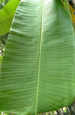 Banana leaves are large, flexible, and waterproof. While generally too tough to actually be eaten, they are often used as ecologically friendly disposable food containers or as "plates" in South Asia and several Southeast Asian countries.[141] In Indonesian cuisine, banana leaf is employed in cooking methods like pepes and botok; banana leaf packages containing food ingredients and spices are cooked in steam or in boiled water, or are grilled on charcoal. Certain types of tamales are wrapped in banana leaves instead of corn husks.[142][143][144]