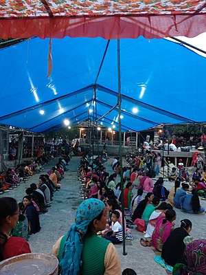 Pangat is a word derived from the Sanskrit word pankti (पङ्क्ति) that means a line, a row, or a group. It is a synonym for Guru Ka Langar. In a Pangat, food is served by volunteers (Sevadars) to people of all religions who sit together to eat.[1] Pangat is about eating food while sitting in rows with no discrimination on the basis of caste, creed and religion.[2] According to the beliefs of Sikhism, nobody sleeps without eating, nor should anybody die of hunger.