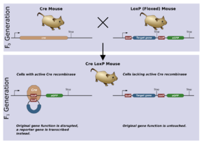In genetics, floxing refers to the sandwiching of a DNA sequence (which is then said to be floxed) between two lox P sites. The terms are constructed upon the phrase "flanking/flanked by LoxP". Recombination between LoxP sites is catalysed by Cre recombinase. Floxing a gene allows it to be deleted (knocked out), translocated or inverted in a process called Cre-Lox recombination. [1] The floxing of genes is essential in the development of scientific model systems as it allows researchers to have spatial and temporal alteration of gene expression.[2] Moreover, animals such as mice can be used as models to study human disease. Therefore, Cre-lox system can be used in mice to manipulate gene expression in order to study human diseases and drug development.[3] For example, using the Cre-lox system, researchers can study oncogenes and tumor suppressor genes and their role in development and progression of cancer in mice models.[4]