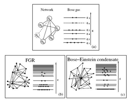The mapping of a Bose gas predicts the existence of two distinct phases as a function of the energy distribution. In the fit-get-rich phase, describing the case of uniform fitness, the fitter nodes acquire edges at a higher rate than older but less fit nodes. In the end the fittest node will have the most edges, but the richest node is not the absolute winner, since its share of the edges (i.e. the ratio of its edges to the total number of edges in the system) reduces to zero in the limit of large system sizes (Fig.2(b)). The unexpected outcome of this mapping is the possibility of Bose–Einstein condensation for T < TBE, when the fittest node acquires a finite fraction of the edges and maintains this share of edges over time (Fig.2(c)).